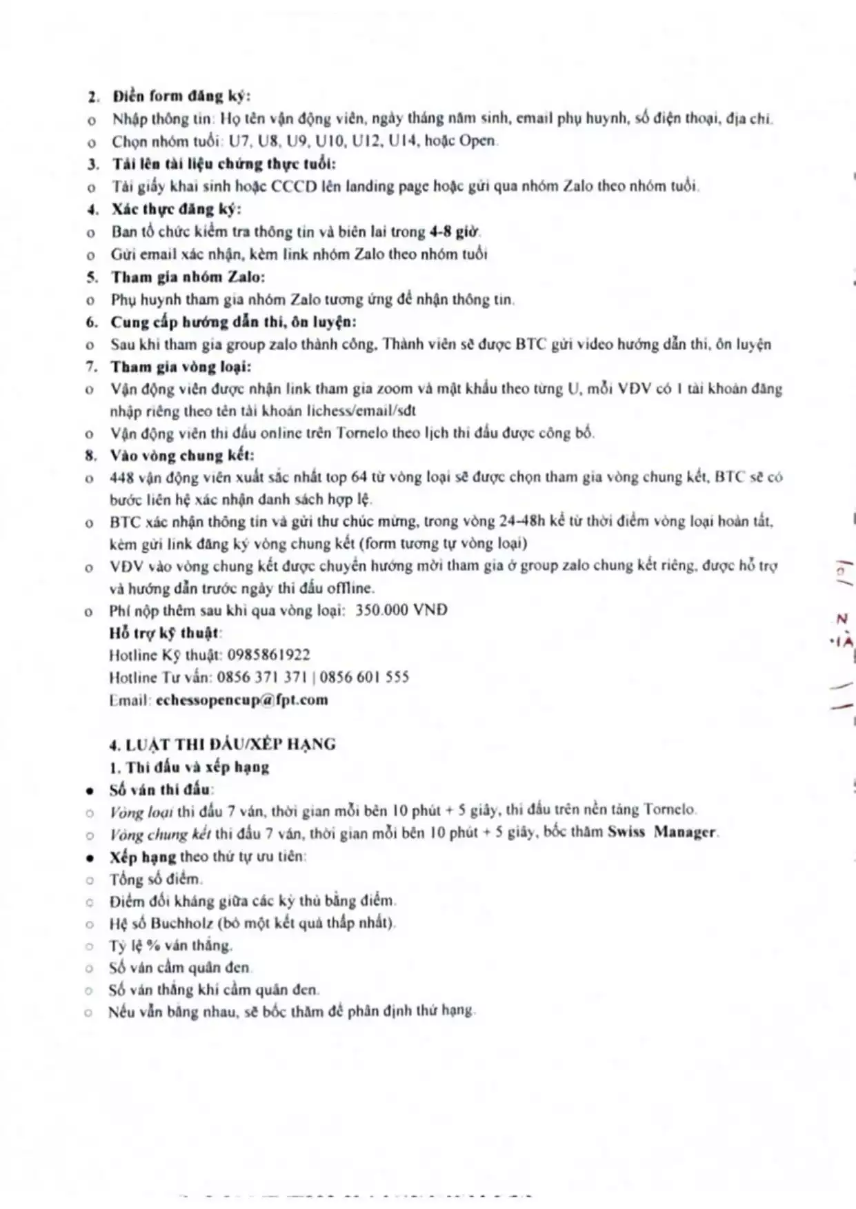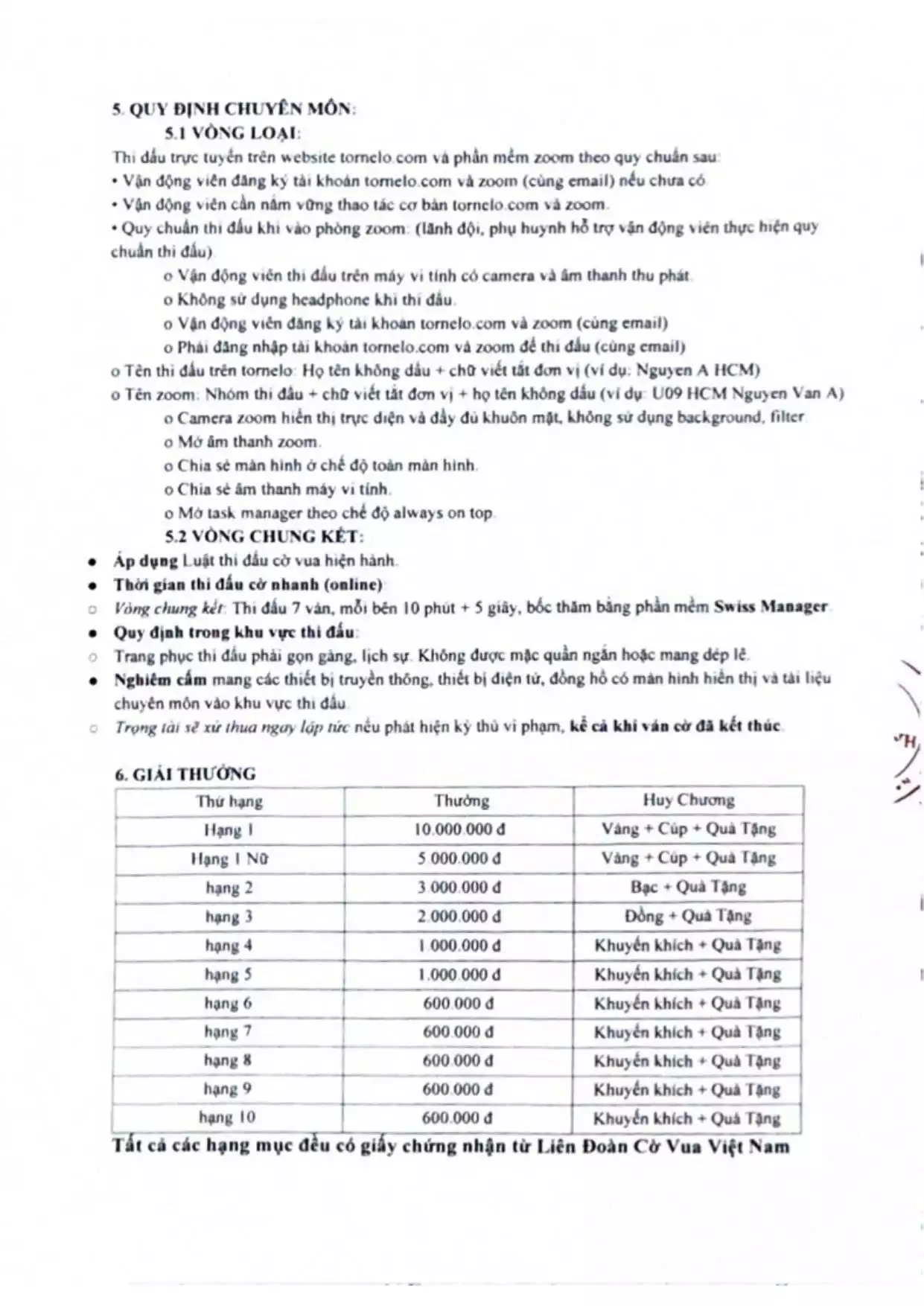 - Thi đấu online trên Tornelo theo lịch công bố.